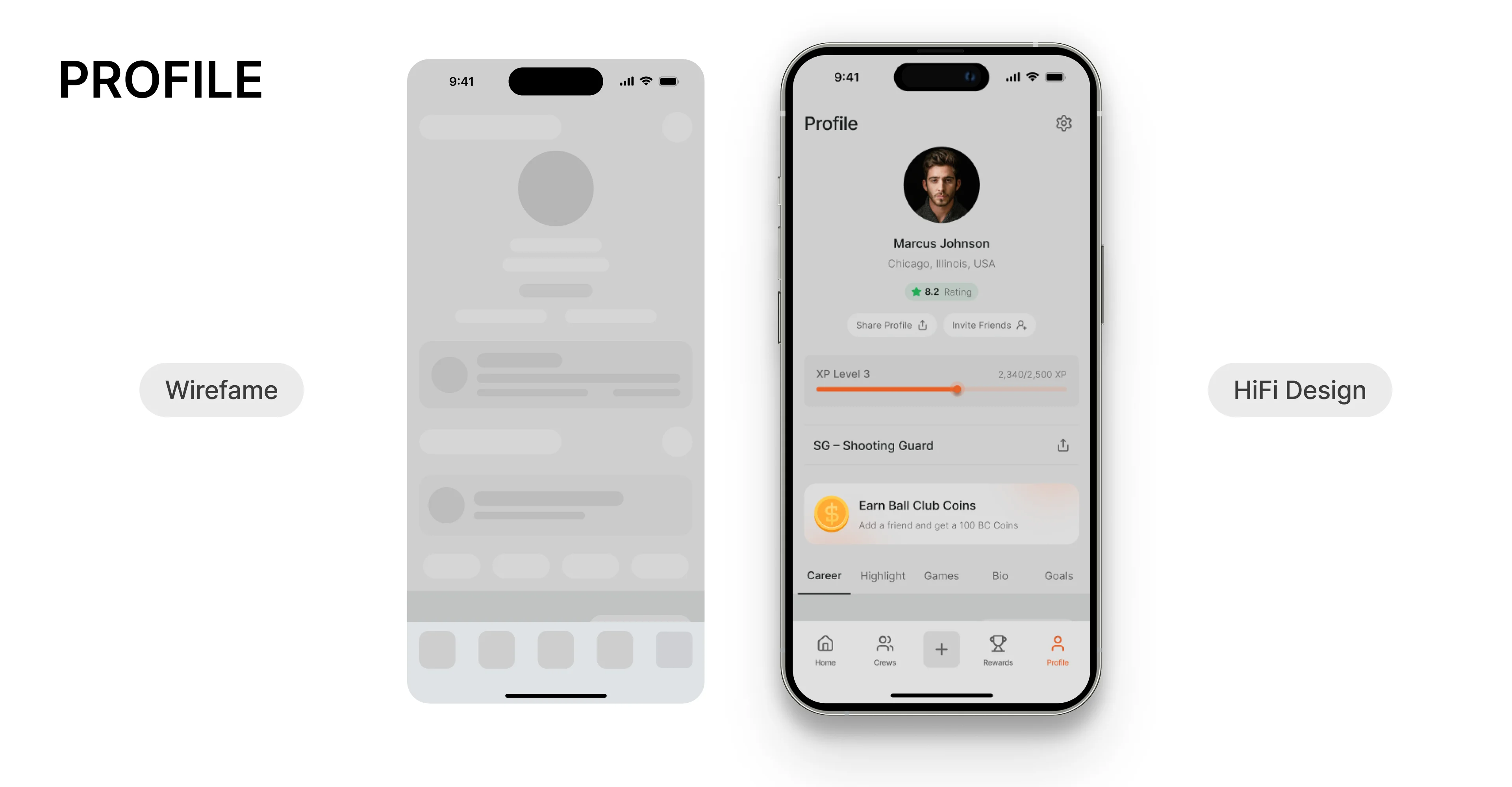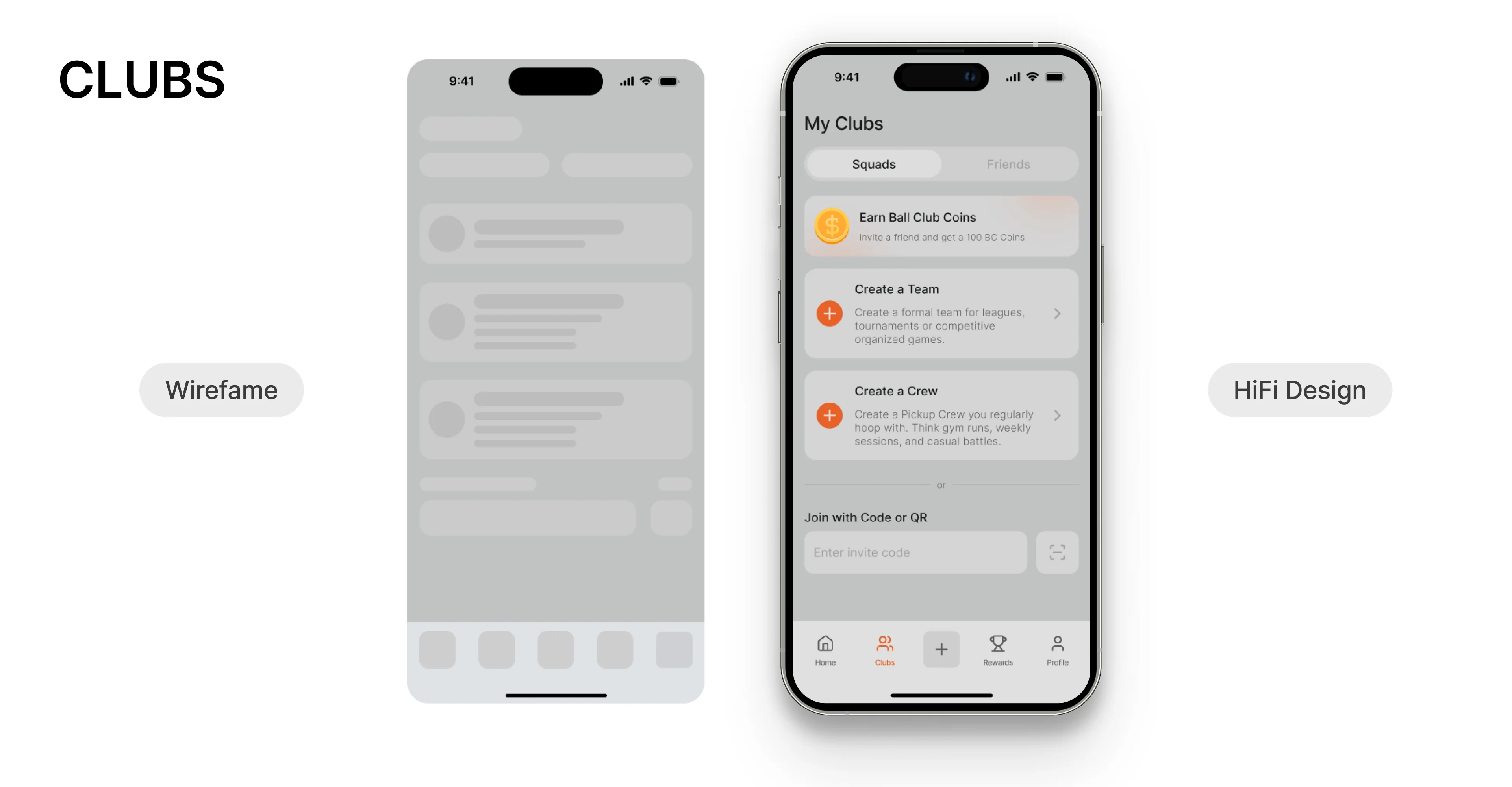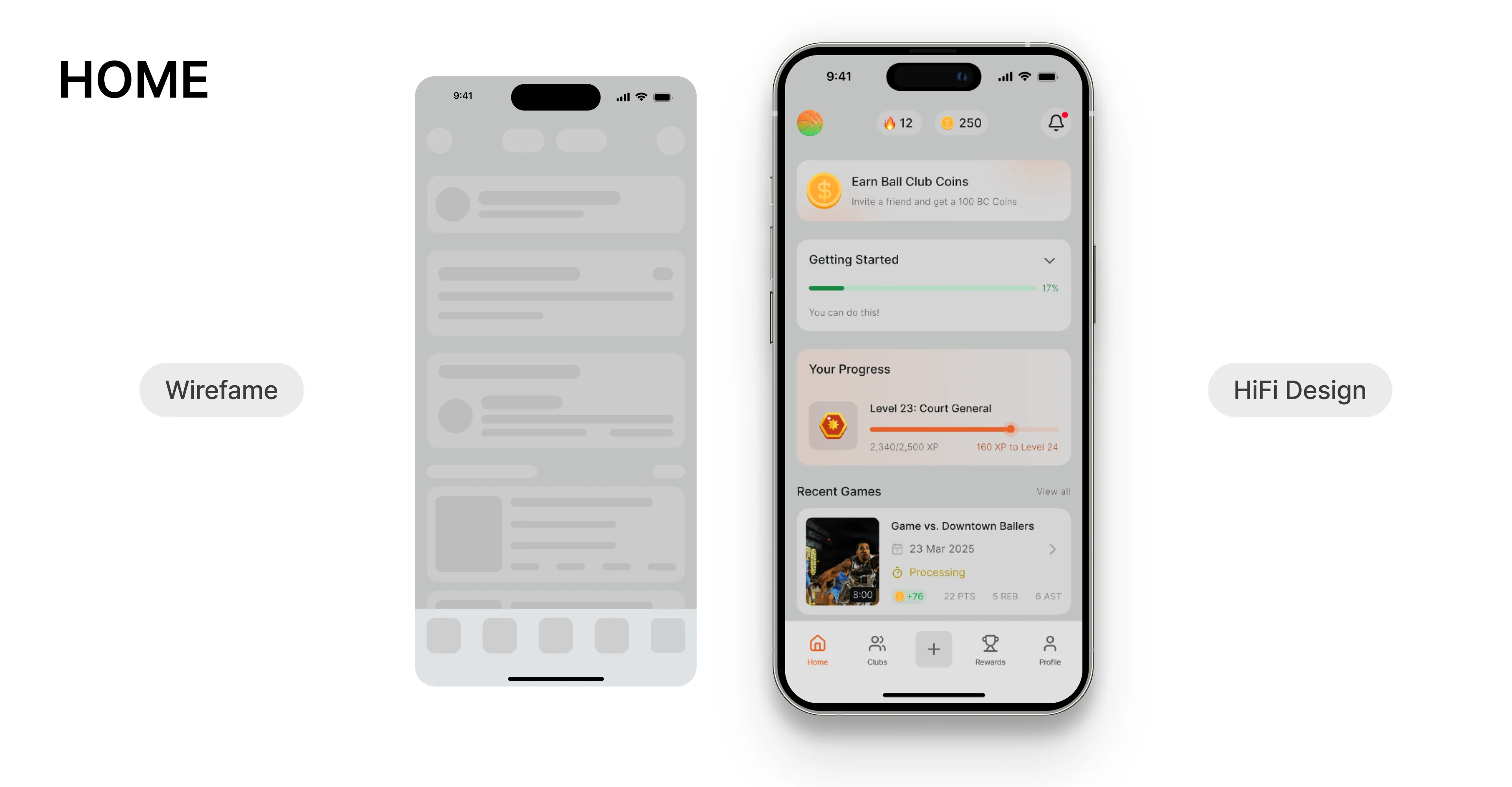 This stage was about moving from research and opportunity framing into tangible design structures. I started with low-fidelity sketches, then evolved them into wireframes that shaped the core flows of the Ball Club experience. Afterwards, I transformed the structured wireframes into a visually compelling, branded product experience. By layering typography, color, and microinteractions on top of the flows, the Ball Club app moved from sketches into something users could immediately connect with.