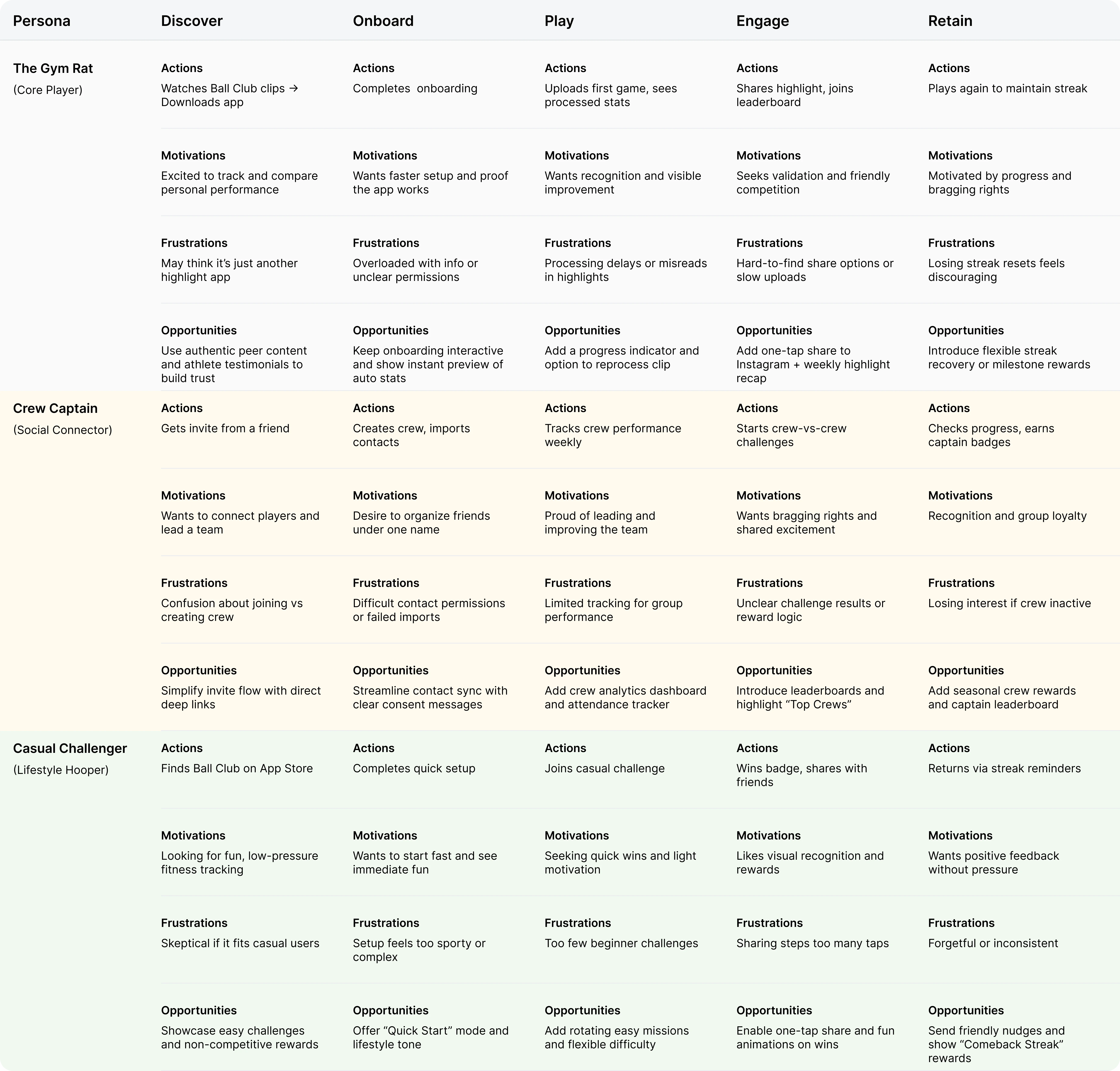 We mapped journeys for each persona to visualize motivations, frustrations, and opportunities across the app lifecycle.
